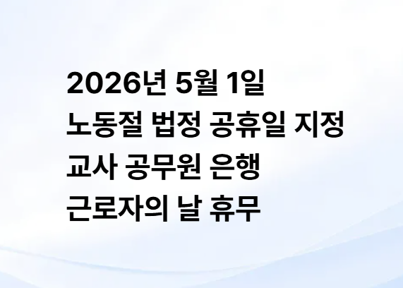 2026년 5월 1일부터 노동절은 법정 공휴일로 지정되어 공무원, 교사, 은행, 회사 근로자 대부분이 쉬는 날로 변경됩니다. 기존 근로자의 날과 달리 관공서까지 휴무가 적용되는 공식 공휴일이라는 점이 핵심입니다. 앞으로는 5월 1일을 전국민 공휴일 노동절로 기억하시면 되며 민원 업무나 은행 업무 일정은 미리 확인하는 것이 좋습니다. 이번 제도 변화는 노동과 휴식의 균형을 강조하는 중요한 정책 변화라고 볼 수 있습니다.